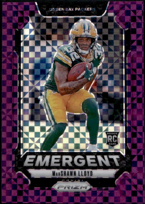 The MarShawn Lloyd 2024 Prizm #18 Emergent - Purple Power /49 Rookie card is 1 of 113 MarShawn Lloyd's card variations in the 2024 Prizm set being tracked by Sports Card Investor, including Base, Choice Blue Yellow Green, Choice Silver, Disco, and Green.