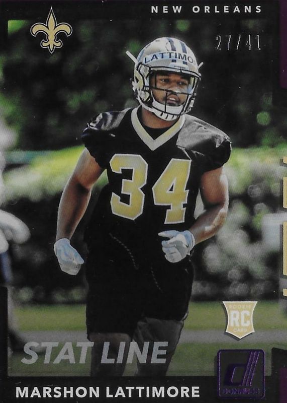 The Marshon Lattimore 2017 Donruss #386 Season Stat Line (/41) Rookie card in Raw condition has not changed in price in the last 30 days and was last sold for $2.99 .
