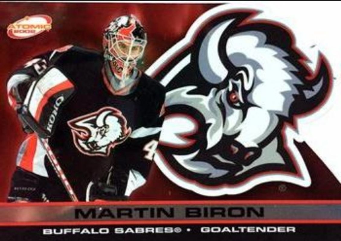 The Martin Biron 2001 Pacific Atomic #10 Base /500 card is 1 of 5 Martin Biron's card variations in the 2001 Pacific Atomic set being tracked by Sports Card Investor, including Red /290, Gold /200, Premiere Date /90, and Blue /9.