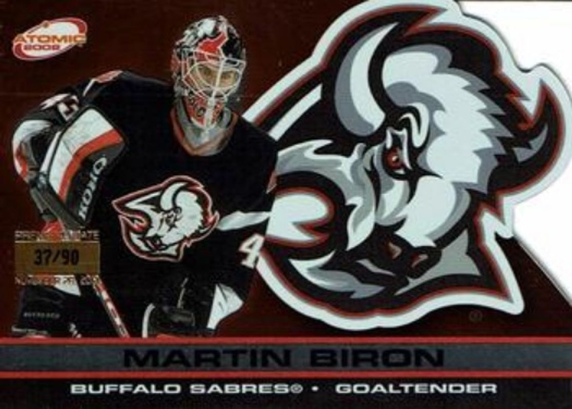 The Martin Biron 2001 Pacific Atomic #10 Premiere Date /90 card is 1 of 5 Martin Biron's card variations in the 2001 Pacific Atomic set being tracked by Sports Card Investor, including Base /500, Red /290, Gold /200, and Blue /9.