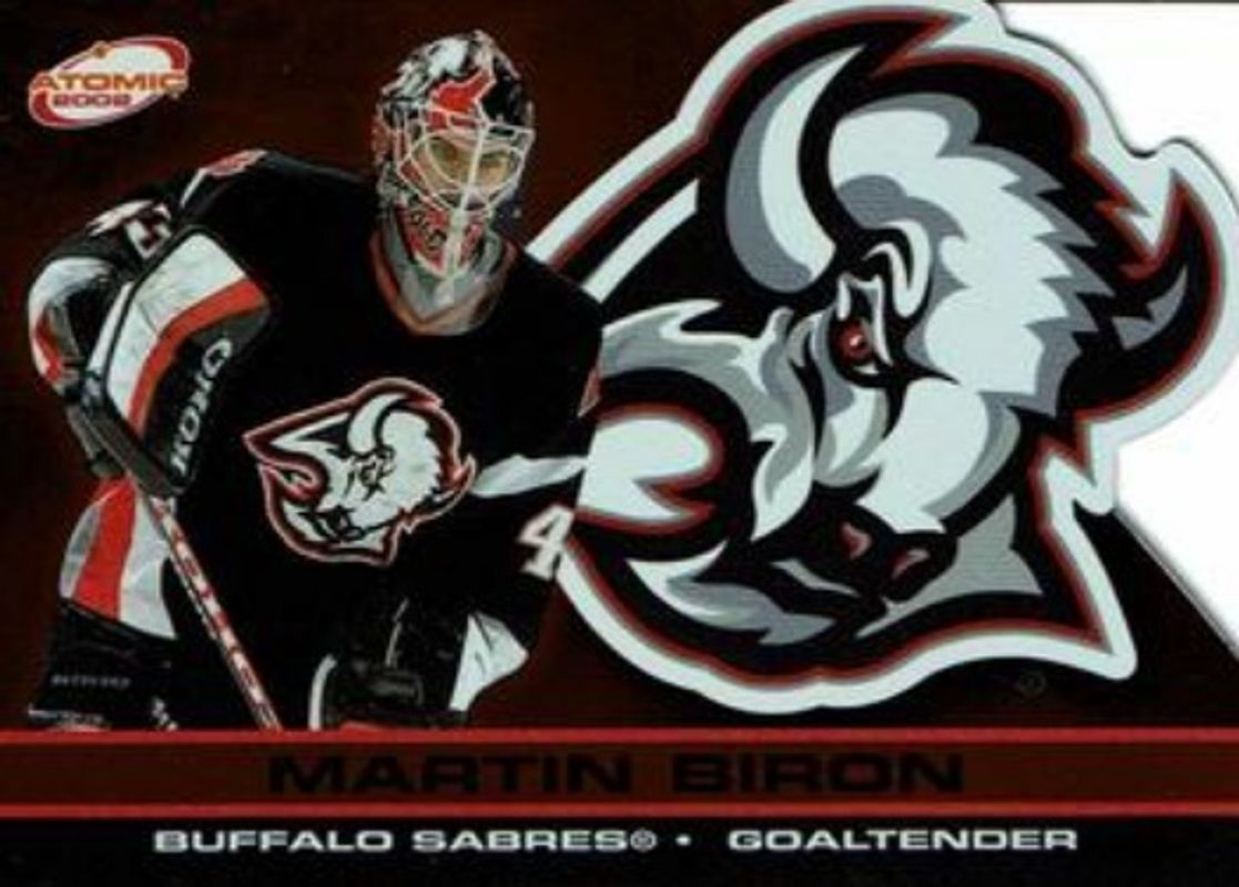 The Martin Biron 2001 Pacific Atomic #10 Red /290 card is 1 of 5 Martin Biron's card variations in the 2001 Pacific Atomic set being tracked by Sports Card Investor, including Base /500, Gold /200, Premiere Date /90, and Blue /9.