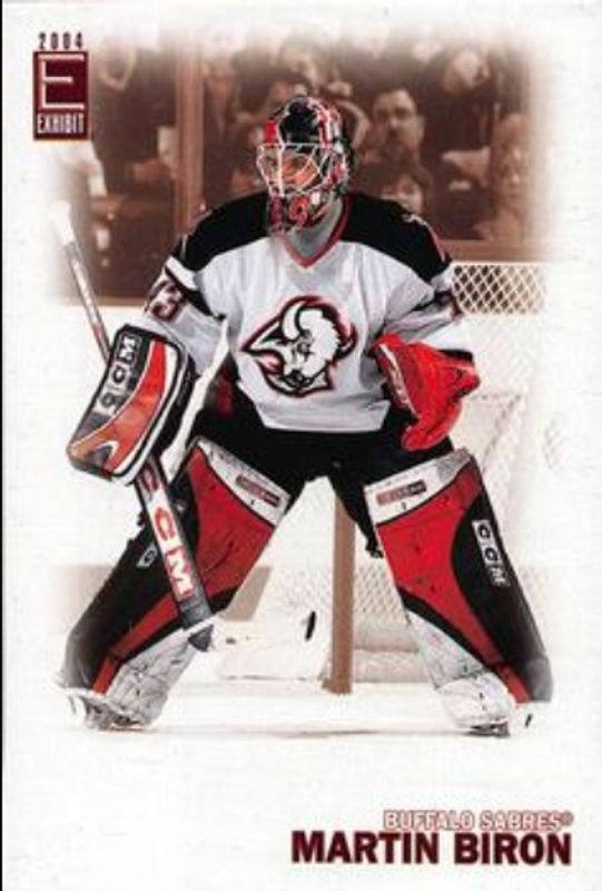 The Martin Biron 2003 Pacific Exhibit #156 Base /955 card is 1 of 4 Martin Biron's card variations in the 2003 Pacific Exhibit set being tracked by Sports Card Investor, including Base /955, Silver /465, and Blue Backs /275.