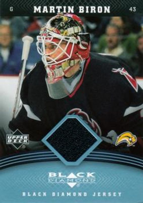 The Martin Biron 2006 Upper Deck Black Diamond #J-MB Jerseys card is 1 of 5 Martin Biron's card variations in the 2006 Upper Deck Black Diamond set being tracked by Sports Card Investor, including Jerseys Ruby /100, Jerseys Gold /10, Jerseys Black /1, and Jerseys Black Autographs /1.