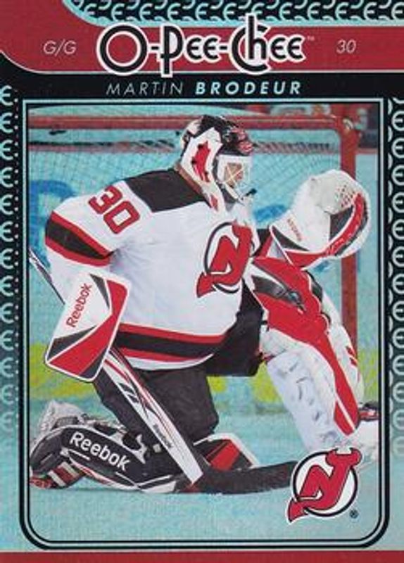 The Martin Brodeur 2009 O-Pee-Chee #30 Rainbow card is 1 of 9 Martin Brodeur's card variations in the 2009 O-Pee-Chee set being tracked by Sports Card Investor, including Base, Retro, Retro Blank Back, Retro Rainbow /100, and Blaster Box Bottoms.