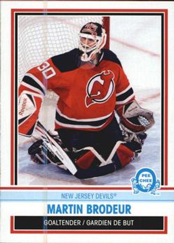 The Martin Brodeur 2009 O-Pee-Chee #30 Retro card is 1 of 9 Martin Brodeur's card variations in the 2009 O-Pee-Chee set being tracked by Sports Card Investor, including Base, Rainbow, Retro Blank Back, Retro Rainbow /100, and Blaster Box Bottoms.