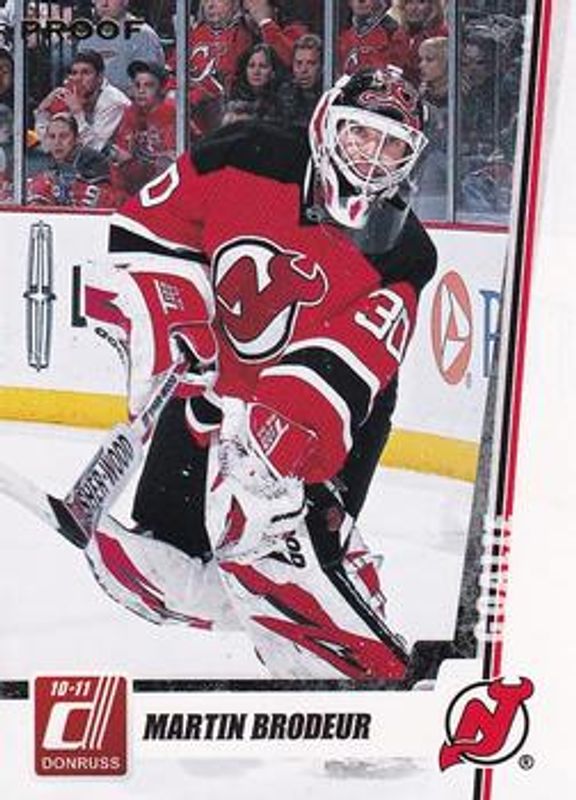 The Martin Brodeur 2010 Donruss #77 Press Proofs /100 card is 1 of 10 Martin Brodeur's card variations in the 2010 Donruss set being tracked by Sports Card Investor, including Base, Boys of Winter, Boys of Winter Threads, Les Gardiens, and Boys of Winter Threads Prime /100.