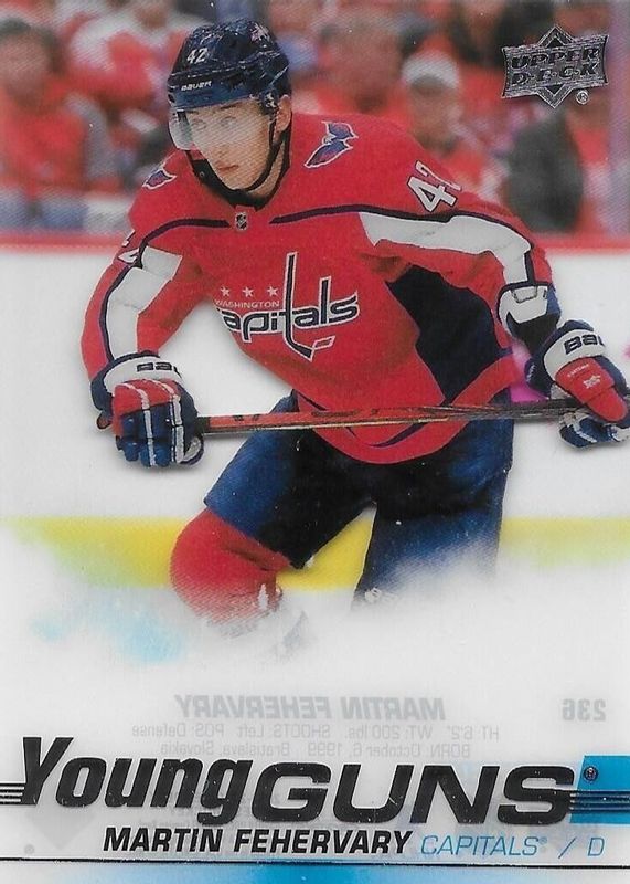 The Martin Fehervary 2019 Upper Deck #236 Young Guns - Clear Cut Rookie card in Raw condition has not changed in price in the last 30 days and was last sold for $16.00 .