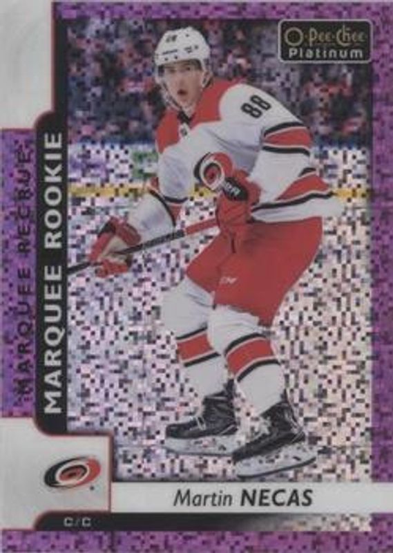 The Martin Necas 2017 O-Pee-Chee Platinum #182 Violet Pixels Rookie card is 1 of 23 Martin Necas' card variations in the 2017 O-Pee-Chee Platinum set being tracked by Sports Card Investor, including Base, Rainbow, Red Prism /199, Royal Blue Cubes /99, and Seismic Gold /50.