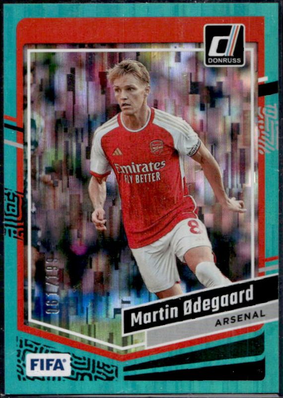 The Martin Odegaard 2023 Donruss #69 Teal /199 card is 1 of 79 Martin Odegaard's card variations in the 2023 Donruss set being tracked by Sports Card Investor, including #69 Base, #42 Base, #69 Optic, #42 Optic, and #42 Cubic.