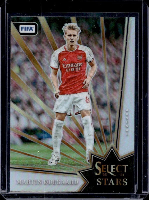 The Martin Odegaard 2023 Select FIFA #1 Select Stars card is 1 of 17 Martin Odegaard's card variations in the 2023 Select FIFA set being tracked by Sports Card Investor, including White Sparkle, Select Memorabilia, Select Stars Blue Pulsar, Select Stars Peacock, and Artistic Impressions /(SSP).