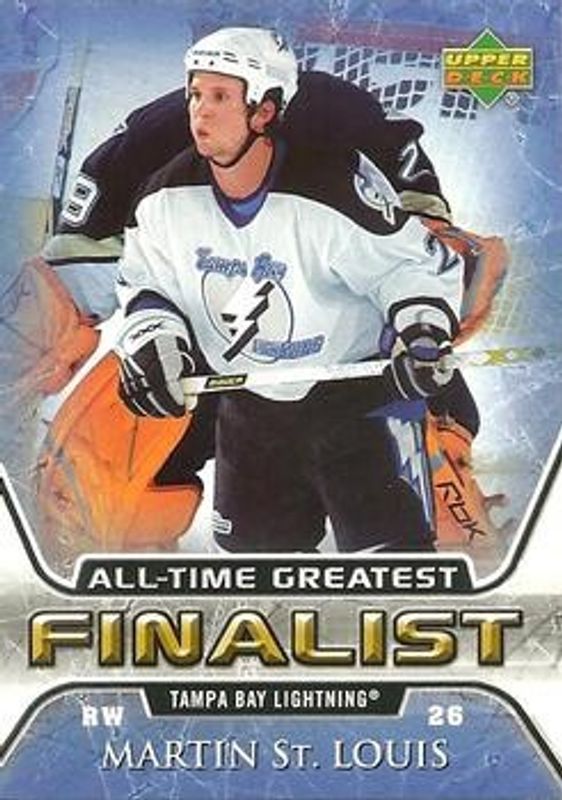 The Martin St. Louis 2005 Fleer Ultra #53 2005 Upper Deck NHL All Time Greatest Finalist card is 1 of 14 Martin St. Louis' card variations in the 2005 Fleer Ultra set being tracked by Sports Card Investor, including Base, Gold Medallion, Ice Medallion /25, Difference Makers, and Difference Makers Jerseys.