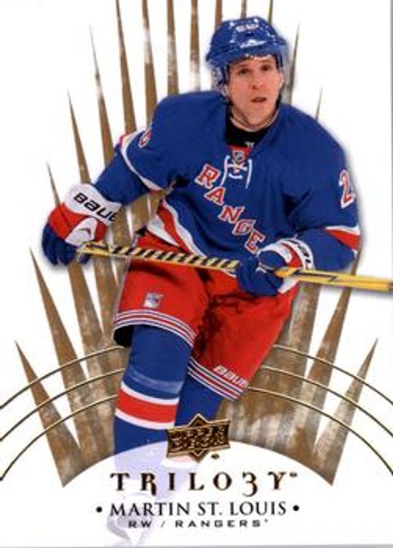 The Martin St. Louis 2014 Upper Deck Trilogy #71 Base /799 card is 1 of 11 Martin St. Louis' card variations in the 2014 Upper Deck Trilogy set being tracked by Sports Card Investor, including Radiant Blue /499, Radiant Green /199, Radiant Black /3, Printing Plates Black /1, and Printing Plates Cyan /1.