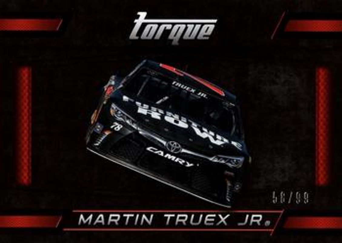 The Martin Truex Jr. 2016 Torque NASCAR #89 Red /99 card is 1 of 68 Martin Truex Jr.'s card variations in the 2016 Torque NASCAR set being tracked by Sports Card Investor, including #89 Base, #13 Base, #89 Gold, #13 Gold, and #13 Blue /125.