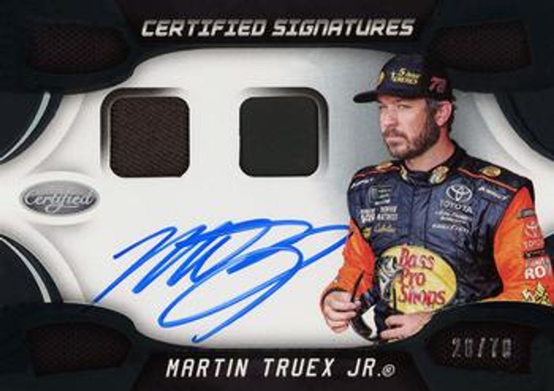 The Martin Truex Jr. 2018 Certified NASCAR #CSS-MT Certified Signatures Swatches /99 card is 1 of 102 Martin Truex Jr.'s card variations in the 2018 Certified NASCAR set being tracked by Sports Card Investor, including #92 Base /149, #26 Base /149, #92 Orange /249, #26 Orange /249, and #92 Mirror Gold /25.