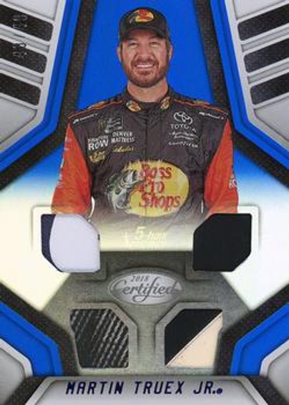 The Martin Truex Jr. 2018 Certified NASCAR #CM-MT Complete Materials - Blue /49 card is 1 of 102 Martin Truex Jr.'s card variations in the 2018 Certified NASCAR set being tracked by Sports Card Investor, including #92 Base /149, #26 Base /149, #92 Orange /249, #26 Orange /249, and #92 Mirror Gold /25.