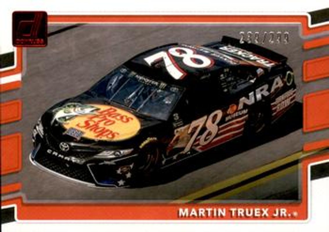 The Martin Truex Jr. 2018 Donruss NASCAR #83 Red Foil /299 card is 1 of 77 Martin Truex Jr.'s card variations in the 2018 Donruss NASCAR set being tracked by Sports Card Investor, including #139 Base, #83 Base, #49b Base, #49a Base, and #22 Base.