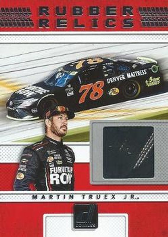 The Martin Truex Jr. 2018 Donruss NASCAR #RR-MT Rubber Relics card is 1 of 77 Martin Truex Jr.'s card variations in the 2018 Donruss NASCAR set being tracked by Sports Card Investor, including #139 Base, #83 Base, #49b Base, #49a Base, and #22 Base.