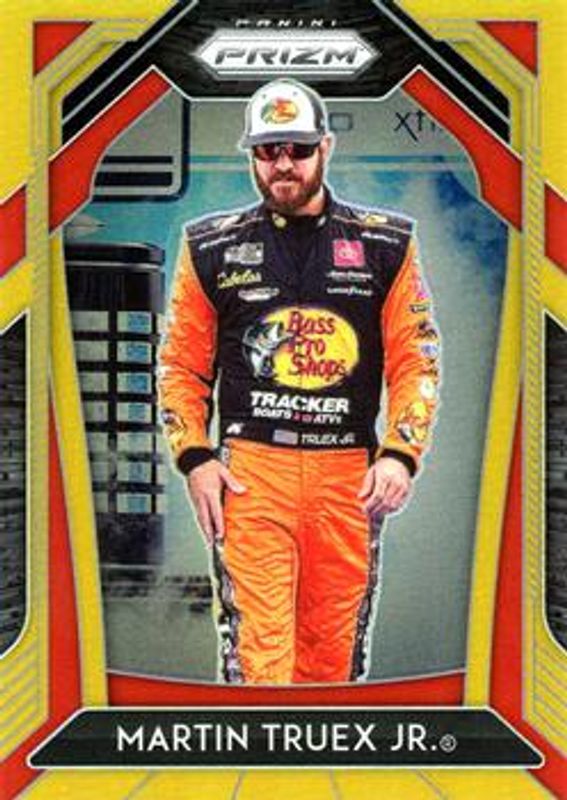 The Martin Truex Jr. 2020 Prizm NASCAR #23 Gold /10 card is 1 of 82 Martin Truex Jr.'s card variations in the 2020 Prizm NASCAR set being tracked by Sports Card Investor, including #23 Base, #73 Base, #23 Blue, #73 Blue, and #23 Blue & Carolina Blue Hyper.