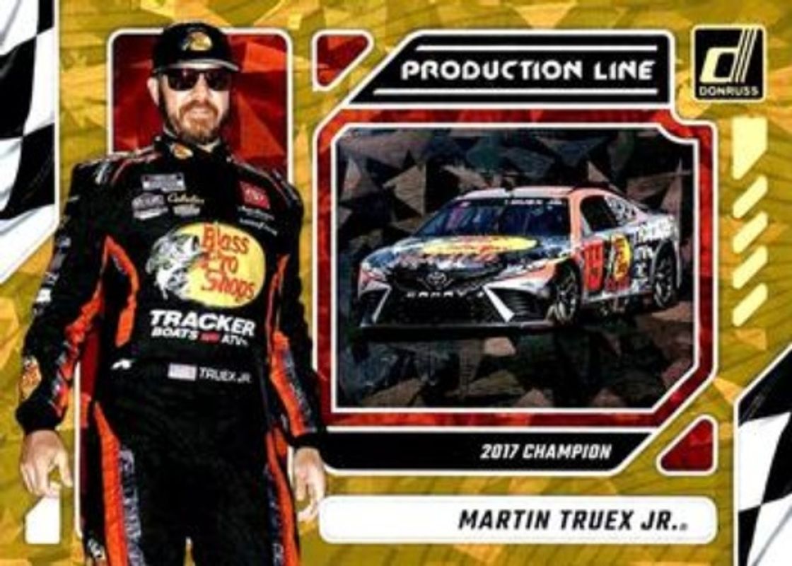 The Martin Truex Jr. 2024 Donruss NASCAR #5 Production Line Gold Ice /10 card is 1 of 151 Martin Truex Jr.'s card variations in the 2024 Donruss NASCAR set being tracked by Sports Card Investor, including #77 Base, #39a Base, #39b Base, #181 Base, and #39 Optic.