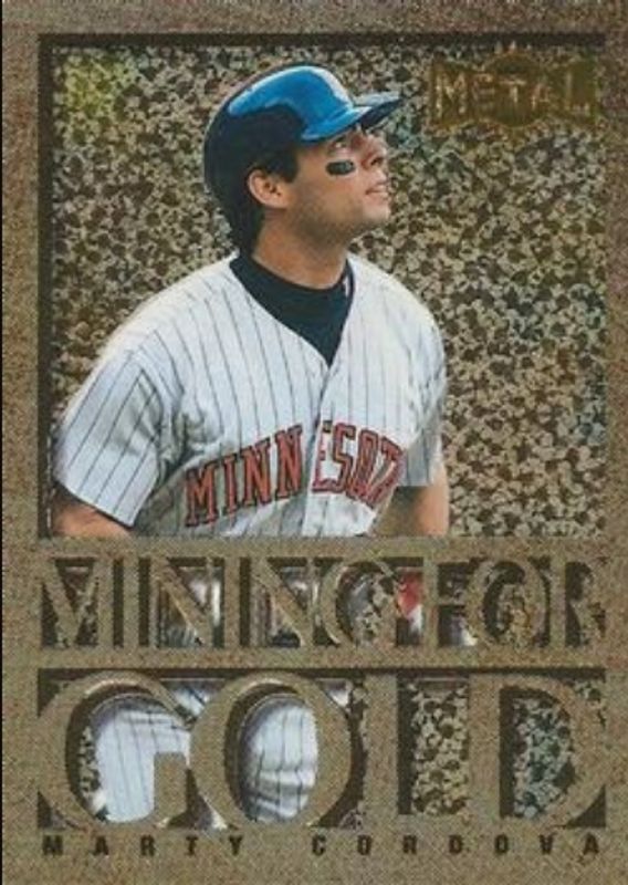 The Marty Cordova 1996 Metal Universe #2 Mining for Gold card is 1 of 4 Marty Cordova's card variations in the 1996 Metal Universe set being tracked by Sports Card Investor, including Base, Platinum, and Platinum Portraits.