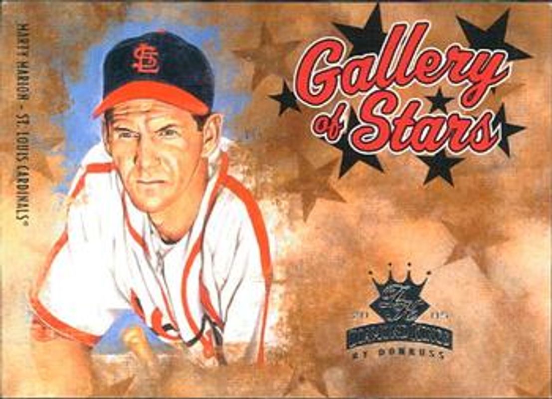 The Marty Marion 2005 Diamond Kings #GS-19 Gallery of Stars card is 1 of 60 Marty Marion's card variations in the 2005 Diamond Kings set being tracked by Sports Card Investor, including Base, Framed Red, Non Canvas, Framed Blue /100, and Bronze /50.