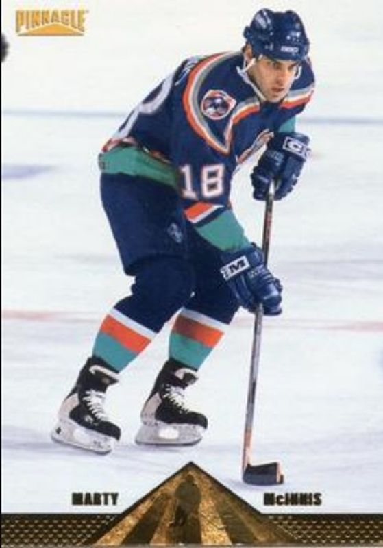 The Marty McInnis 1996 Pinnacle #62 Base card is 1 of 5 Marty McInnis' card variations in the 1996 Pinnacle set being tracked by Sports Card Investor, including Artist's Proofs, Foil, Premium Stock, and Rink Collection.