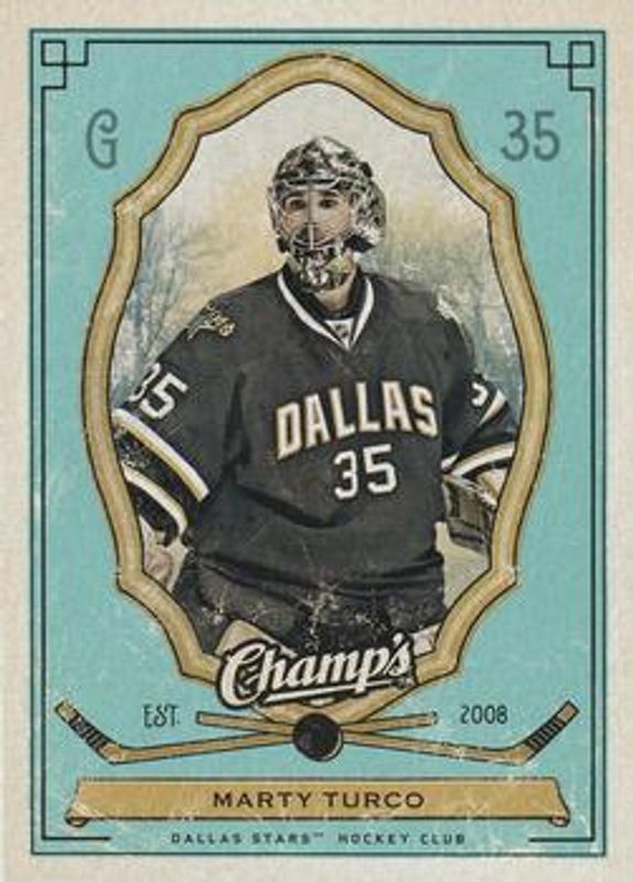 The Marty Turco 2009 Upper Deck Champ's #35 Green card is 1 of 11 Marty Turco's card variations in the 2009 Upper Deck Champ's set being tracked by Sports Card Investor, including #231 Base, #35 Base, #35 Animal Icons, #35 Red, and #35 Yellow.