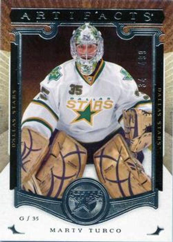 The Marty Turco 2015 Upper Deck Artifacts #134 Base /899 card is 1 of 13 Marty Turco's card variations in the 2015 Upper Deck Artifacts set being tracked by Sports Card Investor, including Ruby /399, Auto Materials Silver /125, Materials Silver /125, Emerald /99, and Sapphire /85.