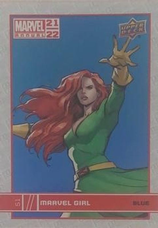 The Marvel Girl 2021 Upper Deck Marvel Annual #51 Blue card is 1 of 15 Marvel Girl's card variations in the 2021 Upper Deck Marvel Annual set being tracked by Sports Card Investor, including Base, Canvas Variant, Green, Magenta, and Red.