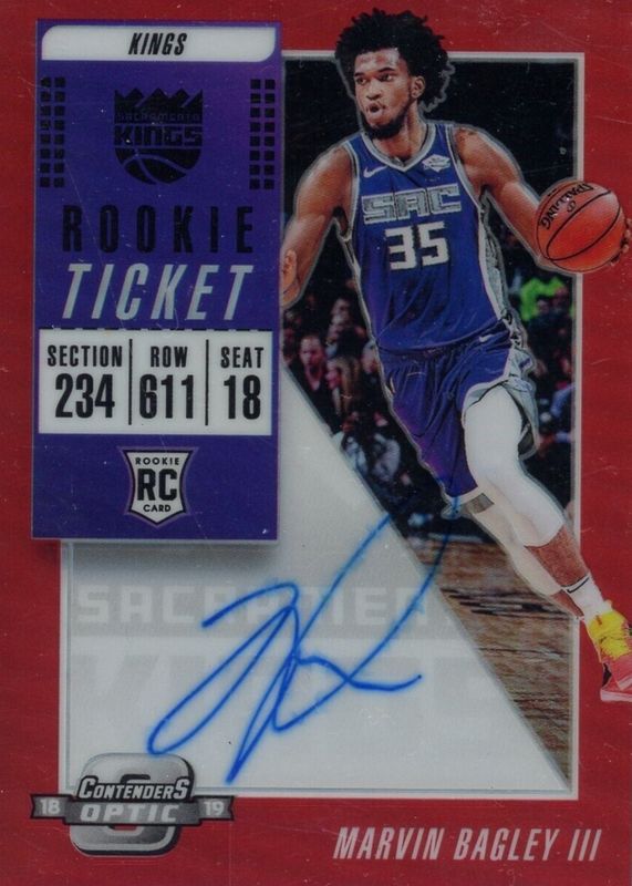 The Marvin Bagley III 2018 Contenders Optic #110 Rookie Ticket Auto - Red /149 (Purple Jersey) card in Raw condition has not changed in price in the last 30 days and was last sold for $9.99 .