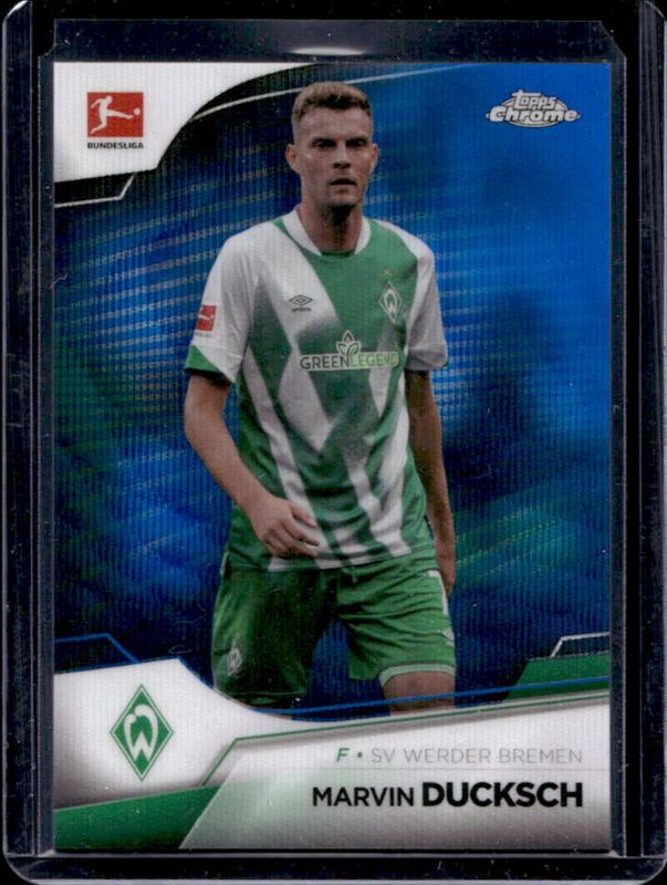 The Marvin Ducksch 2022 Topps Chrome Bundesliga #23 Blue Wave Refractor /180 card is 1 of 19 Marvin Ducksch's card variations in the 2022 Topps Chrome Bundesliga set being tracked by Sports Card Investor, including Base, Refractor, Purple Refractor /299, Aqua Bubble Refractor /275, and Aqua Bubble Wave Refractor /275.