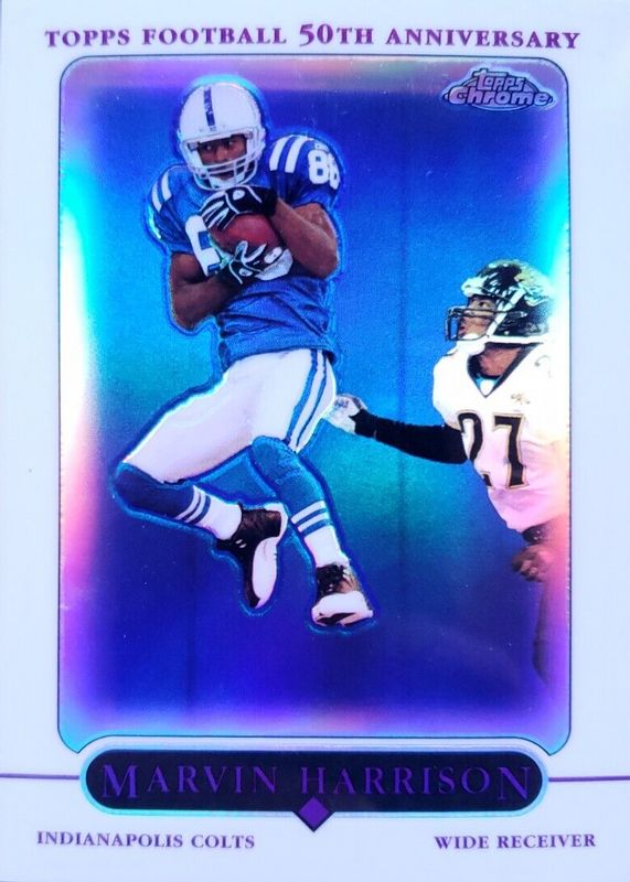 This card is 1 of 12 Marvin Harrison's card variations in the 2005 Topps Chrome set being tracked by Sports Card Investor, including Base, Gold X-Fractor /399, Black Refractor /100, Printing Plate Black /1, and Printing Plate Cyan /1.