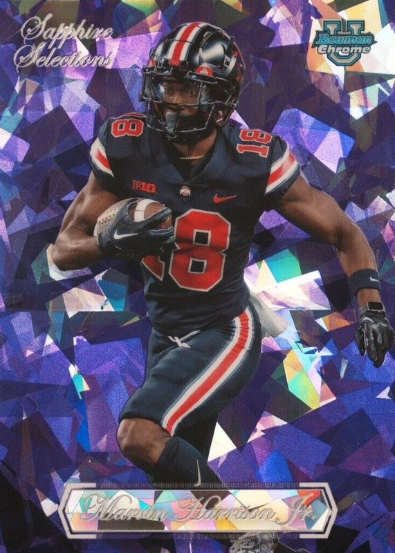 The Marvin Harrison Jr. 2023 Bowman Chrome University Sapphire Edition #100 Purple /10 (1st) card in Raw condition has not changed in price in the last 30 days and was last sold for $140.79 .