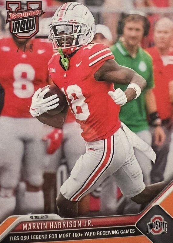 This card is 1 of 18 Marvin Harrison Jr.'s card variations in the 2023 Bowman U Now set being tracked by Sports Card Investor, including #3 Base (Print Run: 2,710), #25 Base (Print Run: 1,656), #18 Base (Print Run: 1,609), #18 Blue /49, and #25 Blue /49.
