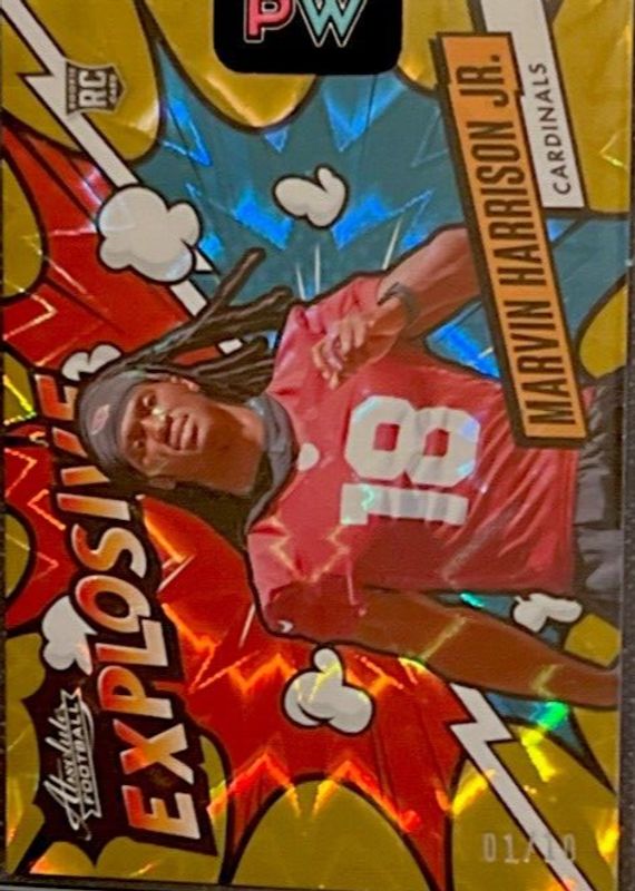 The Marvin Harrison Jr. 2024 Absolute #EX-MHJ Explosive - Gold /10 Rookie card in Raw condition has not changed in price in the last 30 days and was last sold for $1,300.00 .