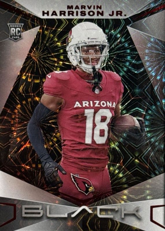 This card is 1 of 12 Marvin Harrison Jr.'s card variations in the 2024 Black set being tracked by Sports Card Investor, including Base, Royal /99, Sapphire /35, Citrine /25, and Emerald /15.