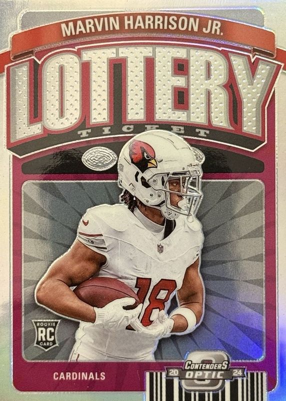 The Marvin Harrison Jr. 2024 Contenders Optic #LT-MHJ Lottery Ticket /(SSP) Rookie card in Raw condition has not changed in price in the last 30 days and was last sold for $9.00 .