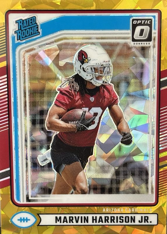 The Marvin Harrison Jr. 2024 Donruss #393 Optic Preview - Gold Ice /10 Rookie card in Raw condition has not changed in price in the last 30 days and was last sold for $340.00 .