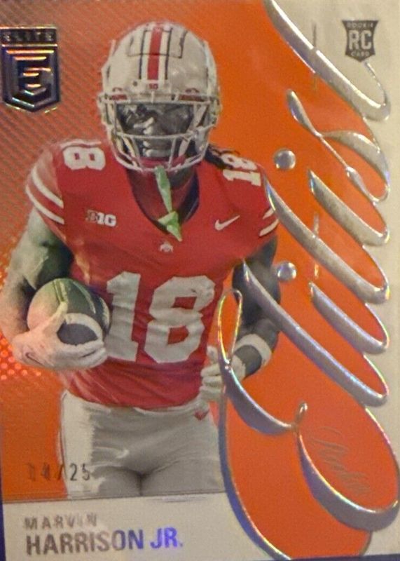 The Marvin Harrison Jr. 2024 Elite #9 Rookie Elitist - Orange /25 card in Raw condition has not changed in price in the last 30 days and was last sold for $46.00 .