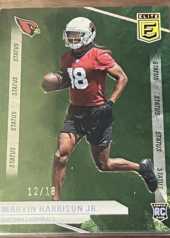 The Marvin Harrison Jr. 2024 Elite #182 Status (/18) Rookie card in Raw condition has not changed in price in the last 30 days and was last sold for $20.50 .