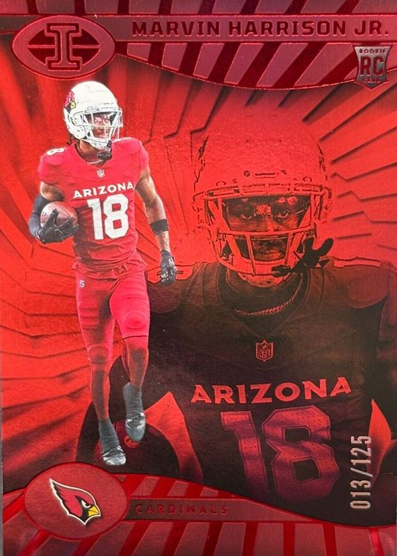 The Marvin Harrison Jr. 2024 Illusions #3 Trophy Collection Ruby /125 Rookie card in Raw condition has not changed in price in the last 30 days and was last sold for $7.50 .