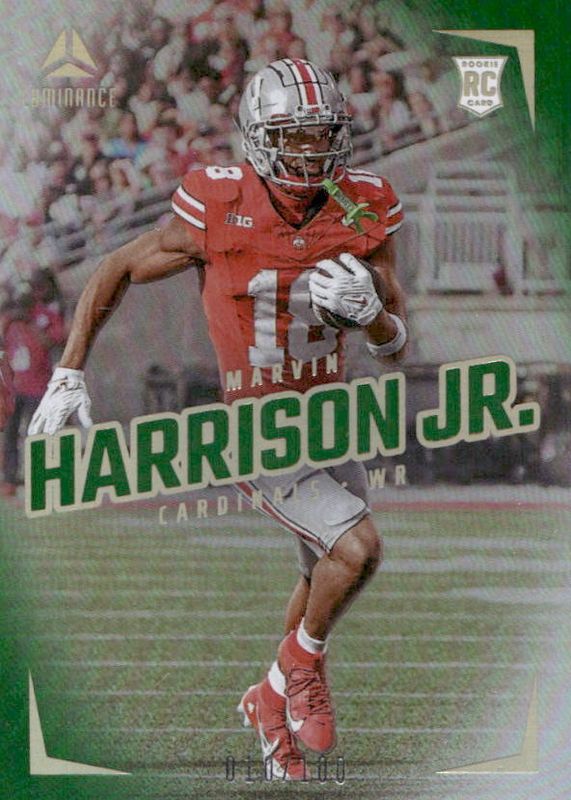 The Marvin Harrison Jr. 2024 Luminance #104 Vertical Rookies - Green /100 card in Raw condition has not changed in price in the last 30 days and was last sold for $4.69 .