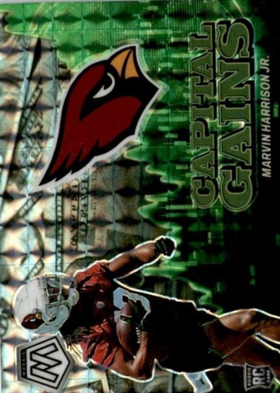 The Marvin Harrison Jr. 2024 Mosaic #22 Capital Gains - Mosaic Rookie card in Raw condition has not changed in price in the last 30 days and was last sold for $8.50 .