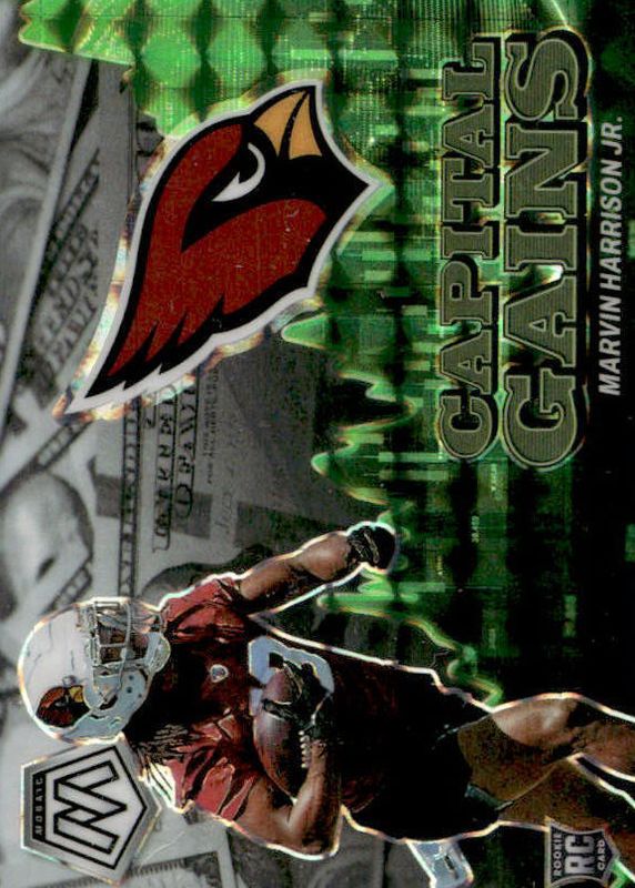The Marvin Harrison Jr. 2024 Mosaic #22 Capital Gains - White /25 Rookie card in Raw condition has not changed in price in the last 30 days and was last sold for $43.00 .