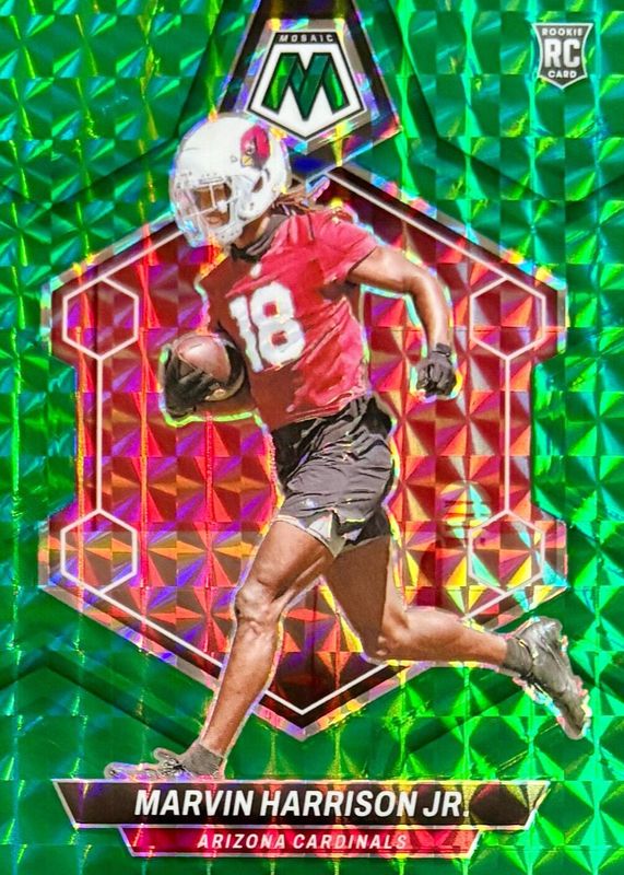 The Marvin Harrison Jr. 2024 Mosaic #304 Green Rookie card in Raw condition has moved up $3.14 (+283%) in the last 30 days and was last sold for $4.25 .