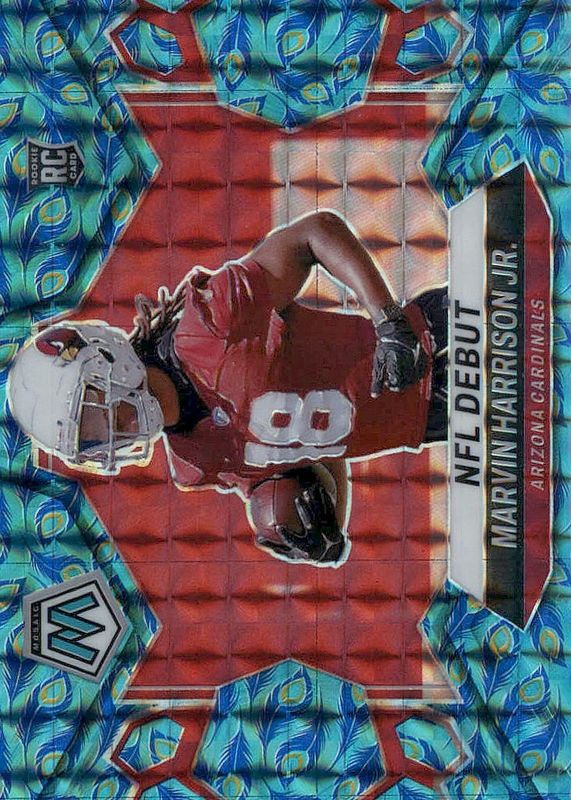 The Marvin Harrison Jr. 2024 Mosaic #283 NFL Debut - Choice Peacock /(SSP) Rookie card in Raw condition has not changed in price in the last 30 days and was last sold for $93.00 .