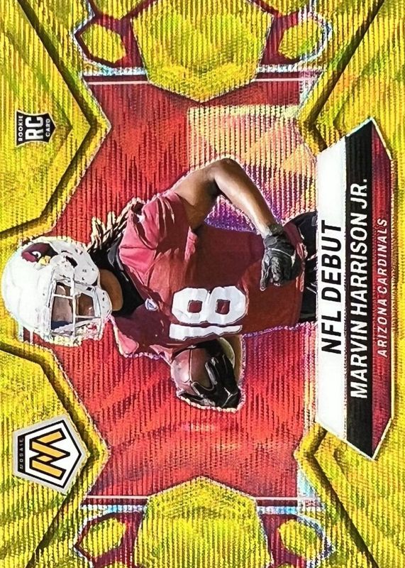 The Marvin Harrison Jr. 2024 Mosaic #283 NFL Debut - Gold Wave /17 Rookie card in Raw condition has not changed in price in the last 30 days and was last sold for $192.50 .