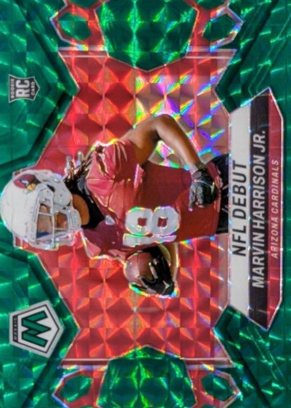 The Marvin Harrison Jr. 2024 Mosaic #283 NFL Debut - Green Rookie card in Raw condition has moved up $0.01 (+1.0%) in the last 30 days and was last sold for $1.00 .