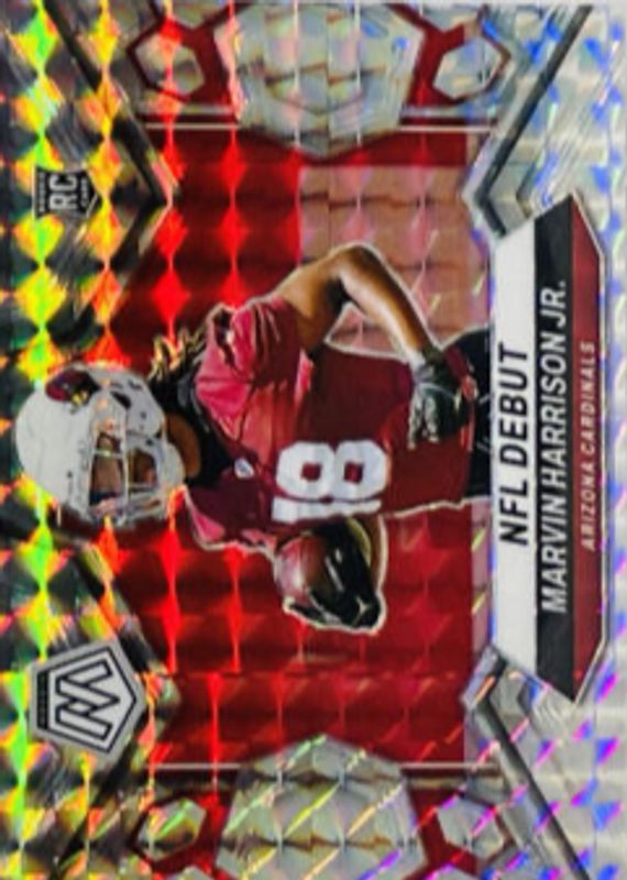 The Marvin Harrison Jr. 2024 Mosaic #283 NFL Debut - Mosaic Rookie card in Raw condition has moved down -$0.35 (-26.1%) in the last 30 days and was last sold for $0.99 .
