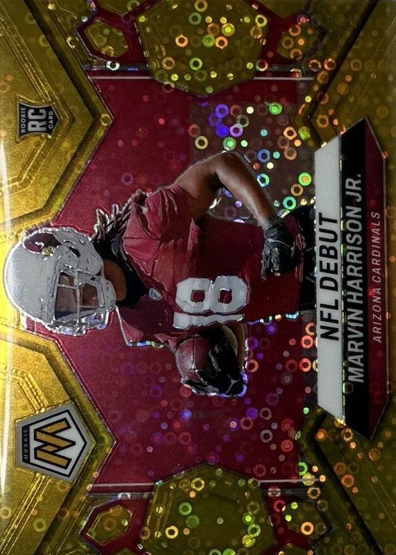 The Marvin Harrison Jr. 2024 Mosaic #283 NFL Debut - No Huddle Gold /10 Rookie card in Raw condition has not changed in price in the last 30 days and was last sold for $199.99 .